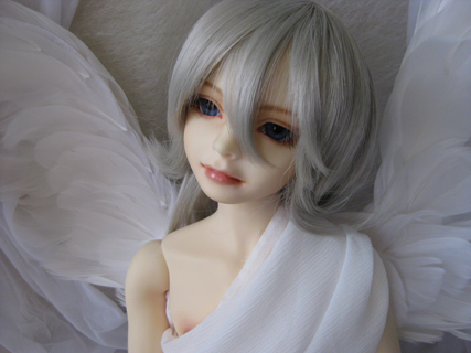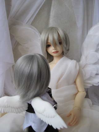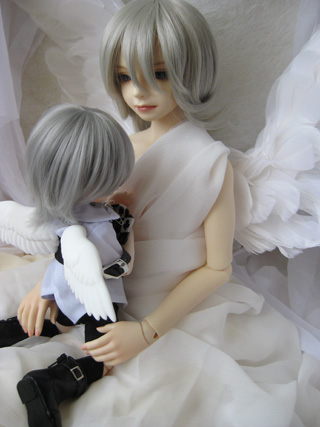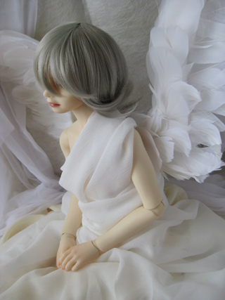 背景は白い布などをたらして、服は布を巻き付けただけなのですが(ボークスの店員さんはこれを天使巻きと言っていた<すみか便りより。)結構様になって大満足!雲の上感(?)が出た気がします。